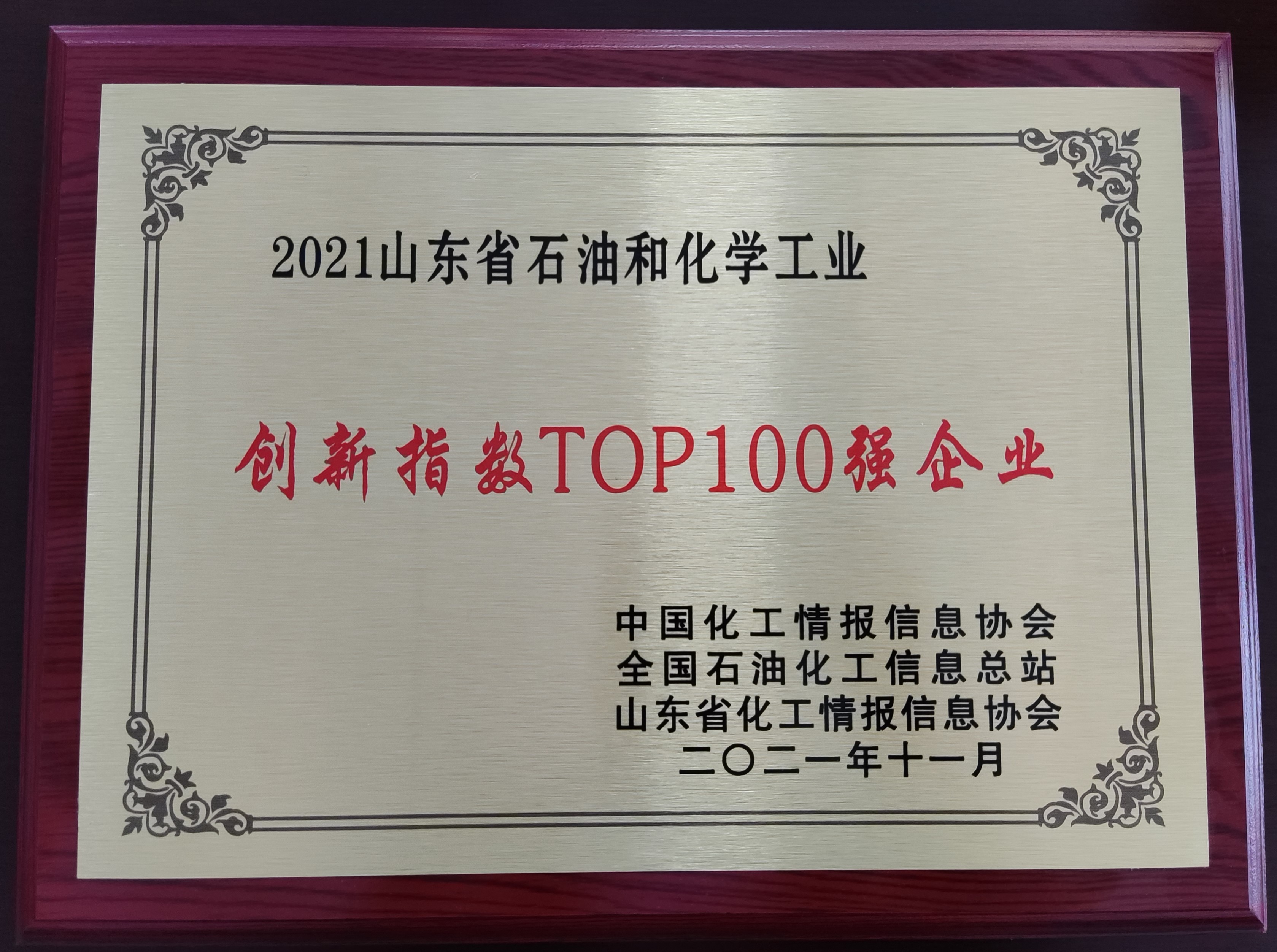 11月23日至24日,由山東省化工情報信息協(xié)會主辦的2021(第十一屆)中國化工產(chǎn)學研高峰論壇在東營廣饒召開。論壇峰會舉行了“2021化工年度精英人物暨明星單位”頒獎盛典,發(fā)布了“2021山東省石油和化學工業(yè)創(chuàng)新指數(shù)top100企業(yè)”榜單。集團公司榮獲“2021山東省石油和化學工業(yè)創(chuàng)新指數(shù)top100企業(yè)”稱號。